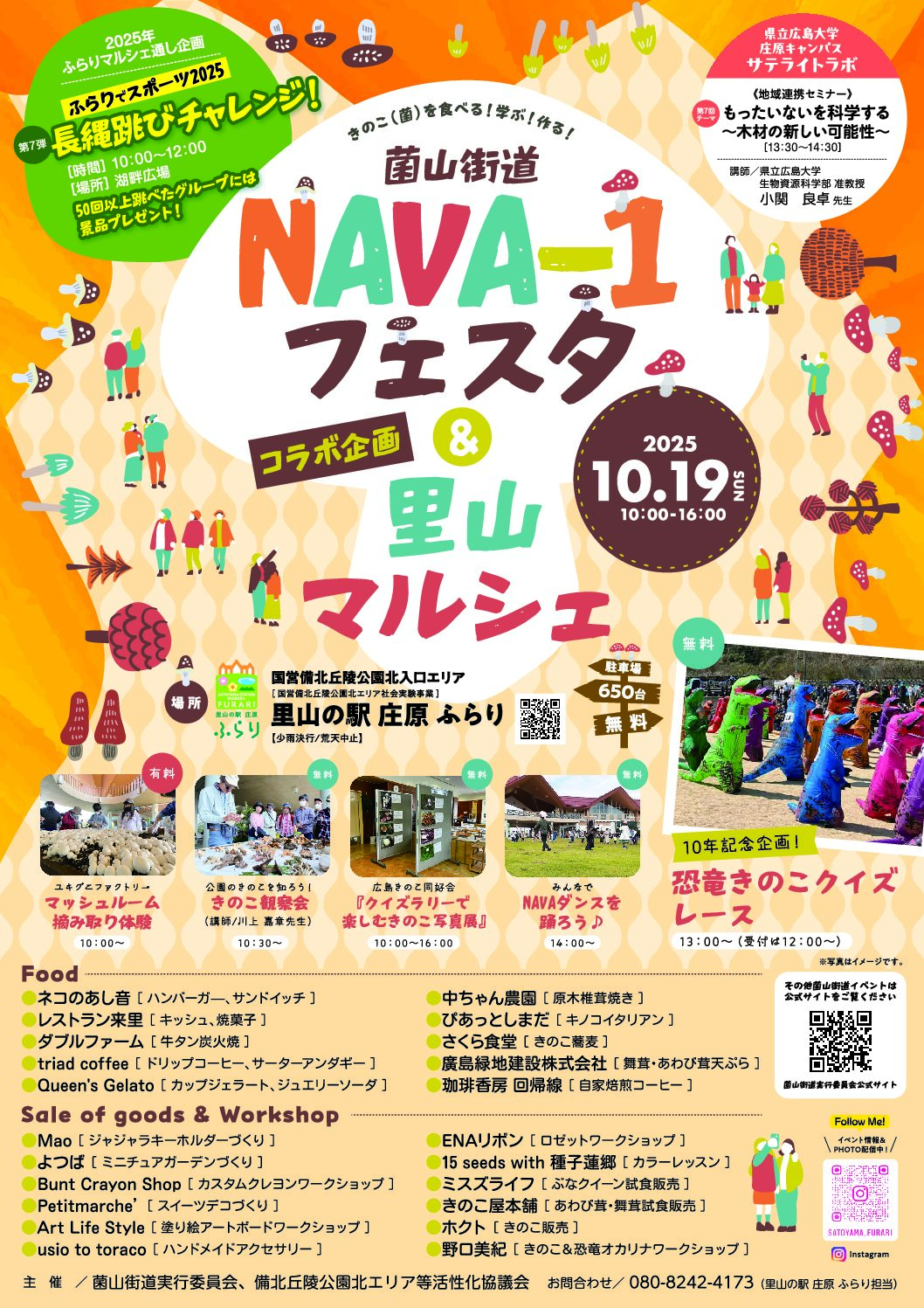 【特設コーナー・イベント】 | ・ふらりでスポーツ2025『第6弾 長縄跳びチャレンジ!』 2025年マルシェでは毎回スポーツの体験会を実施します。※10月は長縄跳びチャレンジ ・県立広島大学庄原キャンパスサテライトラボ 地域連携セミナー 第7回『もったいないを科学する~木材の新しい可能性~』 13:30~14:30 【参加無料】 ・マッシュルーム摘み取り体験 10:00~ 【有料】 ・きのこ観察会 10:30~ 【無料】 ・クイズラリーで楽しむきのこ写真展 10:00~16:00 【無料】 ・NAVAダンスを踊ろう♪ 14:00~ 【無料】 ・恐竜きのこクイズレース 13:00~ 【無料】(受付12:00~) |