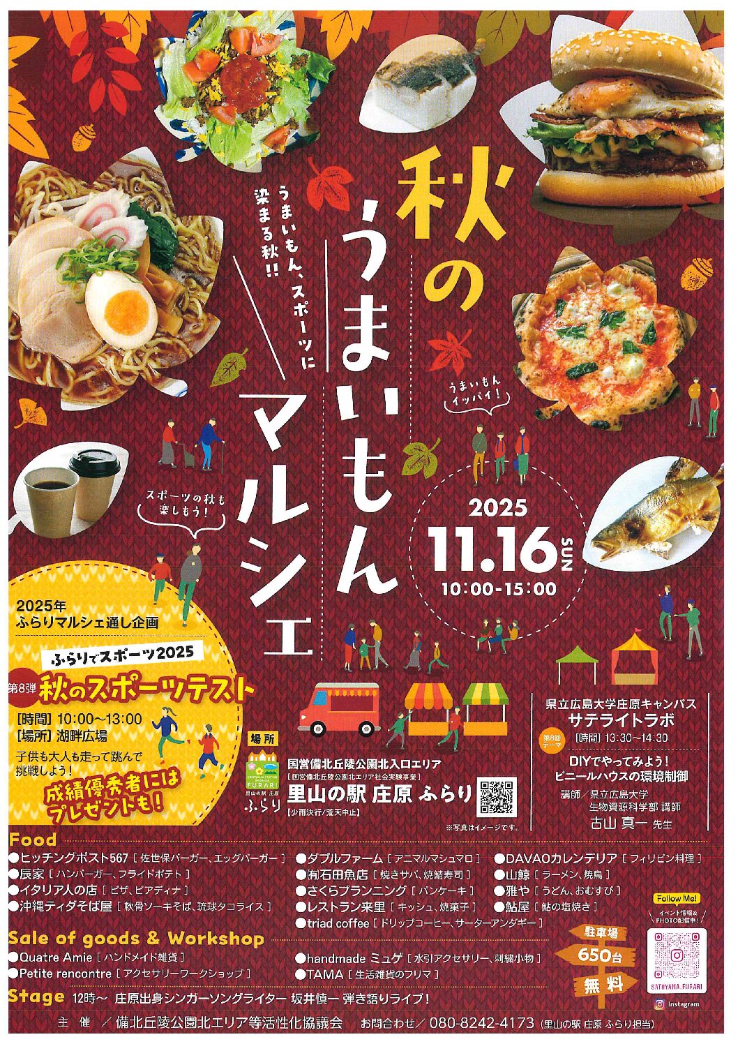 | 【特設コーナー・イベント】 | ・ふらりでスポーツ2025『第8弾 秋のスポーツテスト』 2025年マルシェでは毎回スポーツの体験会を実施します。11月はスポーツテスト ・県立広島大学庄原キャンパスサテライトラボ 地域連携セミナー 第8回『DIYでやってみよう!ビニールハウスの環境制御』 13:30~14:30 参加無料 ・ステージイベント 坂井慎一 弾き語りライブ 12:00~ |